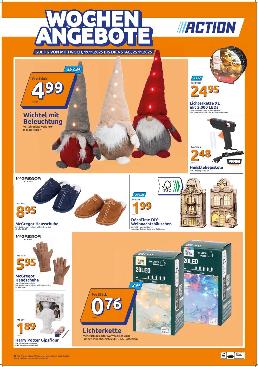 Action präsentiert seinen Kunden vom Mittwoch, dem 19. November 2025, bis Dienstag, dem 25. November 2025, wieder vielfältige Wochenangebote. Entdecken Sie festliche Dekorationen, praktische Haushaltshelfer und tolle Geschenkideen zu unschlagbaren Preisen. Ideal für die bevorstehende Weihnachtszeit!