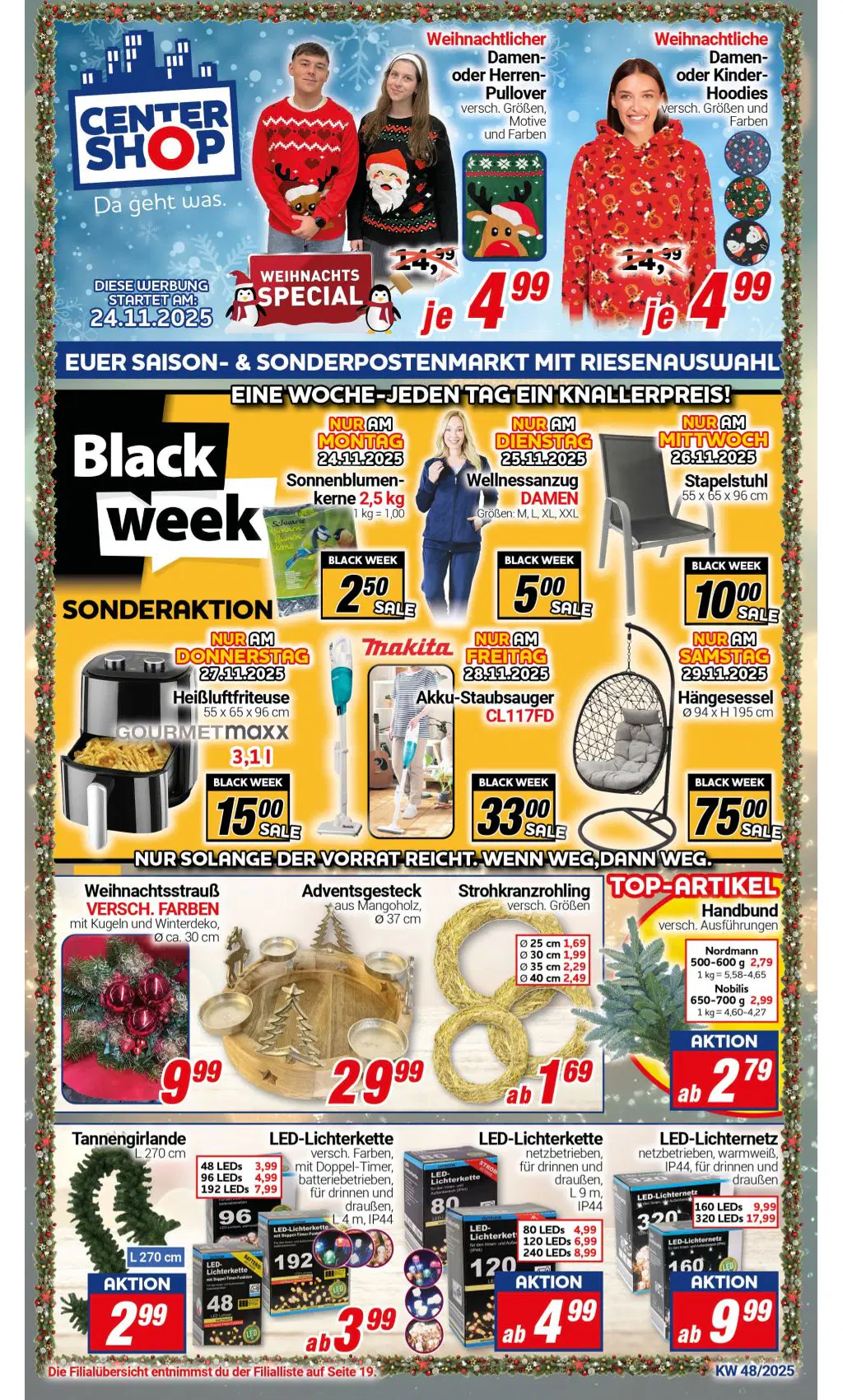 Center Shop startet mit einer Woche voller unschlagbarer Angebote in die Vorweihnachtszeit. Entdecken Sie vom 24.11.2025 an täglich neue Sonderaktionen und festliche Highlights. Hier findet jeder das passende Schnäppchen – aber nur, solange der Vorrat reicht!
