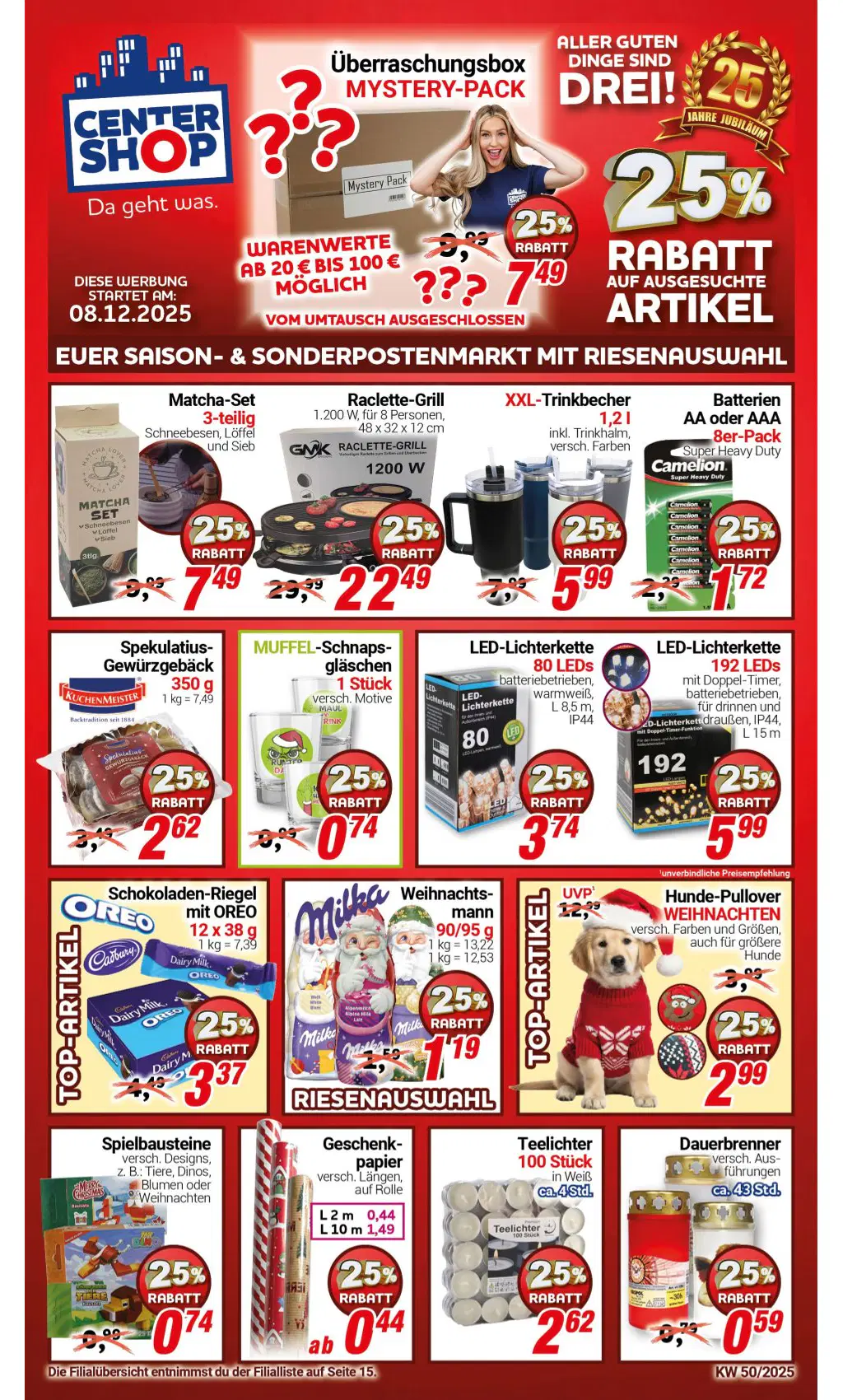 Ab dem 08.12.2025 startet Center Shop mit sensationellen Jubiläumsangeboten in die Saison. Als bekannter Saison- und Sonderpostenmarkt präsentiert das Unternehmen eine riesige Auswahl an stark reduzierten Artikeln für Haushalt, Freizeit und die festliche Zeit.