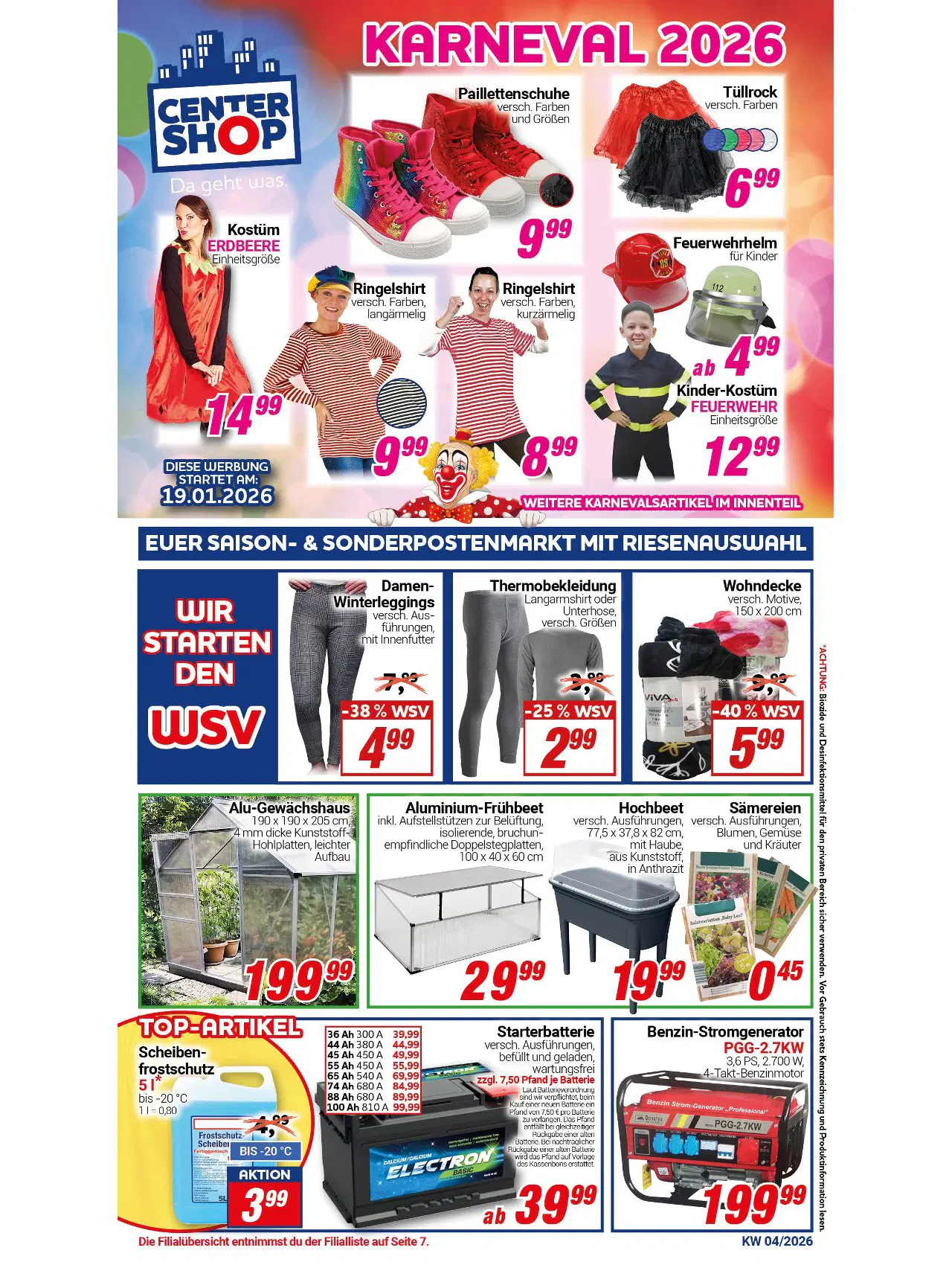 Willkommen zu den neuesten CENTER SHOP Angeboten der Woche! Vom 19.01. bis zum 25.01.2026 erwarten Sie fantastische Deals für Karneval, den Winterschlussverkauf und praktische Artikel für Haus und Garten. Sichern Sie sich jetzt Ihre Favoriten zu unschlagbaren Preisen!