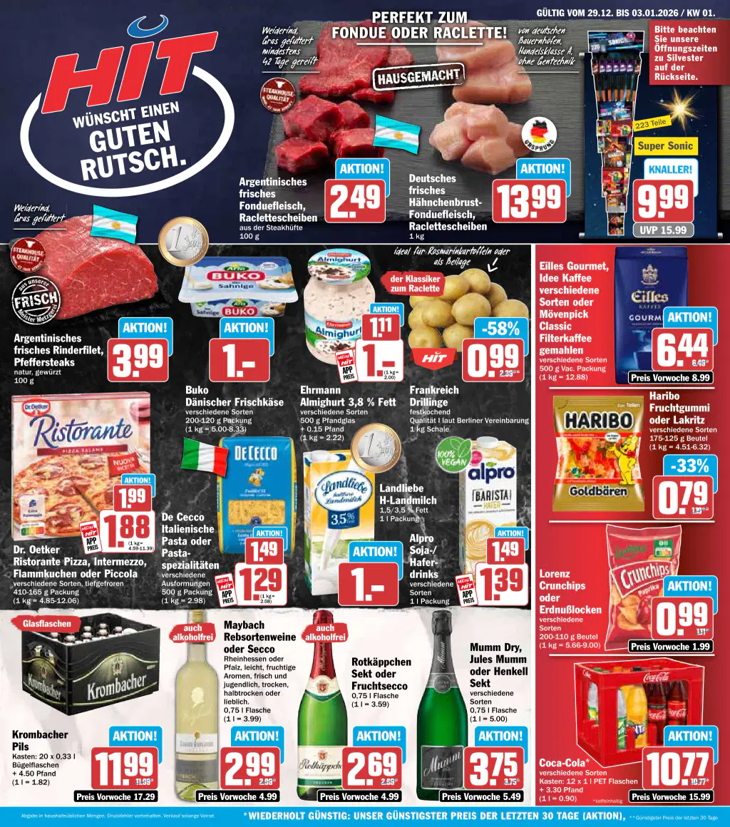 Feiern Sie den Jahreswechsel mit den besten Angeboten bei HIT! Vom 29.12.2025 bis zum 03.01.2026 erwarten Sie fantastische Sparmöglichkeiten für Ihren Einkauf. Bereiten Sie sich auf ein festliches Fondue oder Raclette vor oder stocken Sie Ihre Vorräte an Markenprodukten auf. Sichern Sie sich die Top-Angebote für einen guten Rutsch ins neue Jahr!