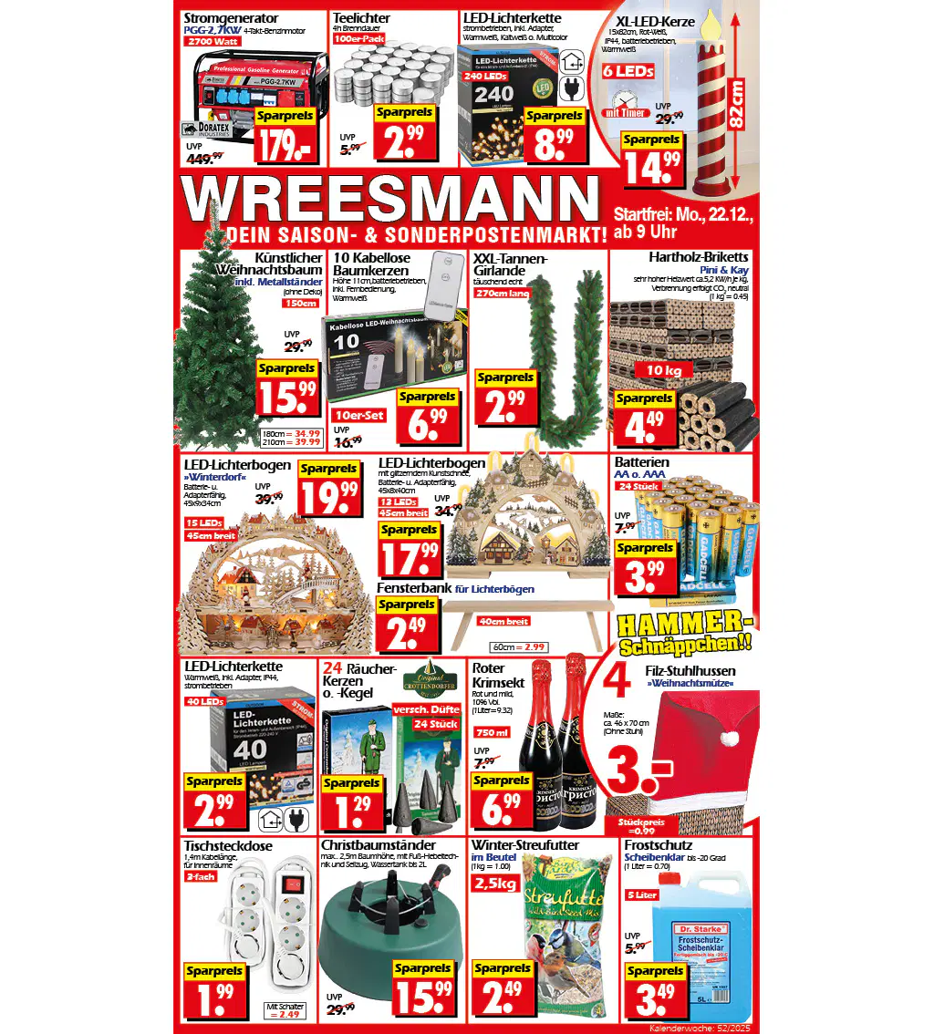 Diese Sparpreise sind nur für kurze Zeit und solange der Vorrat reicht, gültig ab dem 22. Dezember 2025. Besuchen Sie Wreesmann!